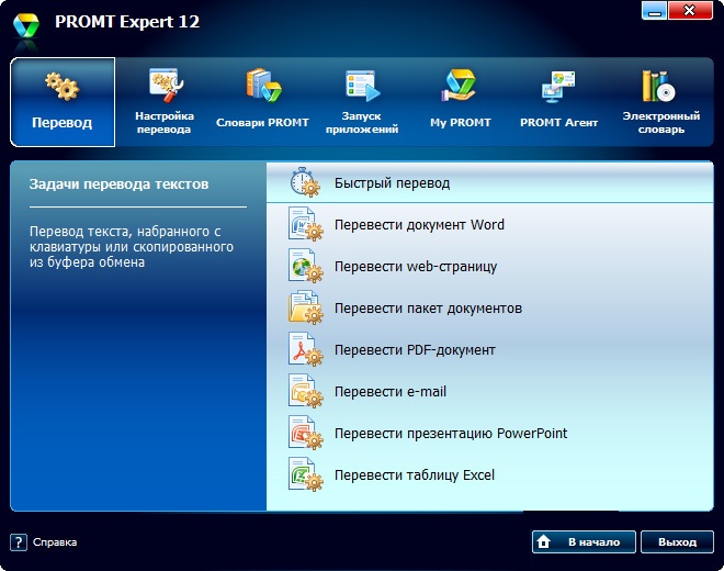 PROMT Expert 12 – лучший переводчик для компьютера, который быстро и качественно переведет необходимый документ или текст. Программа позволяет переводить деловые документы, сайты, письма, сообщения или простые тексты. Поддерживаются следующие языки: русский, английский, немецкий, французский, итальянский, испанский и португальский. Переводчик Промт 12 подходит для всех современных операционных систем Windows, включая новую Windows 10.