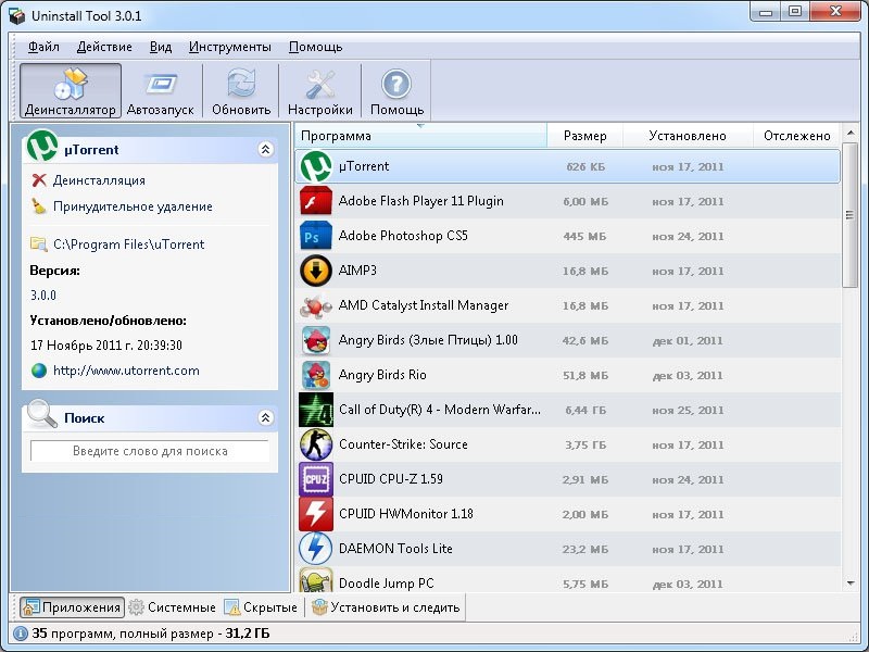 Uninstall Tool 3.4 - удобная программа для установки и удаления приложений на компьютере. Кроме стандартных функций, Uninstall Tool умеет показывать скрытые установленные программы, сортирует список программного обеспечения по заданному фильтру, удаляет неправильно установленные и удаленные программы. Данный деинсталлятор работает на русском языке, не требует ключ и подходит для всех операционных систем Windows. | |